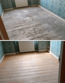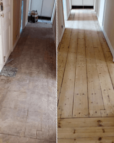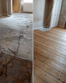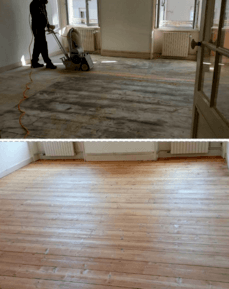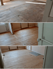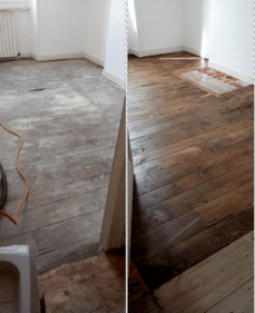 Dégrossi sur colle et ragréage; Rabotage ponçage et polissage finition bois nu et vitrification mat.