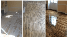 Arrachage moquette; Dégrossi sur ragréage; Ponçage et vitrification acrylique satiné.